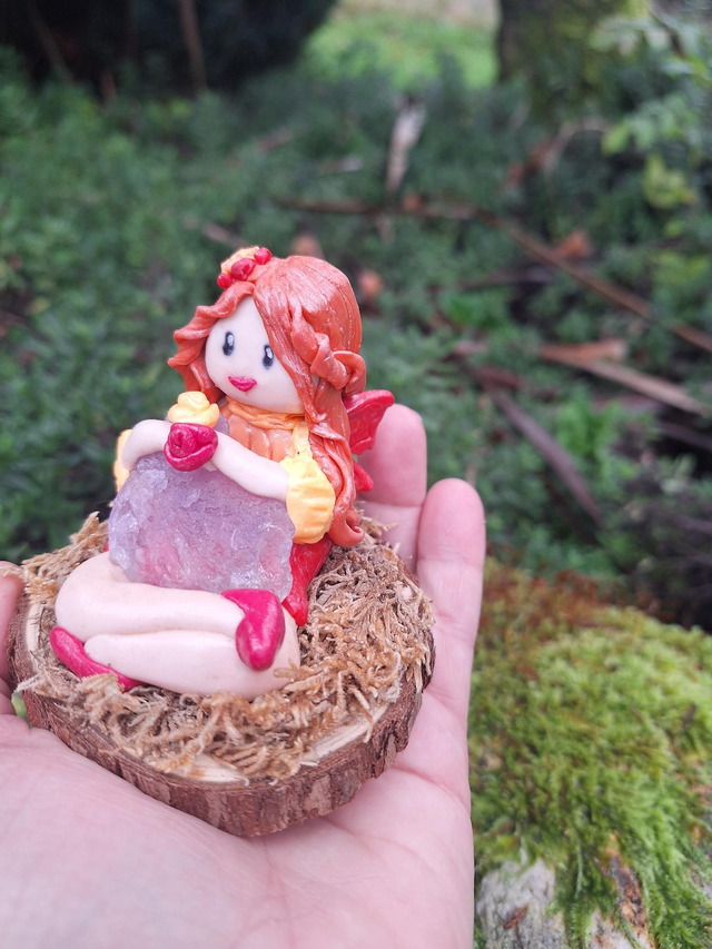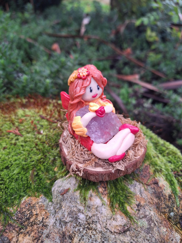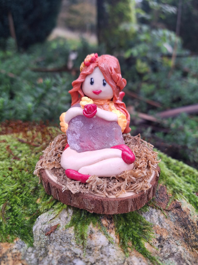 Sur son tapis de mousse, elle veille sur sa pierre d'améthyste afin de diffuser ses douces vibrations.